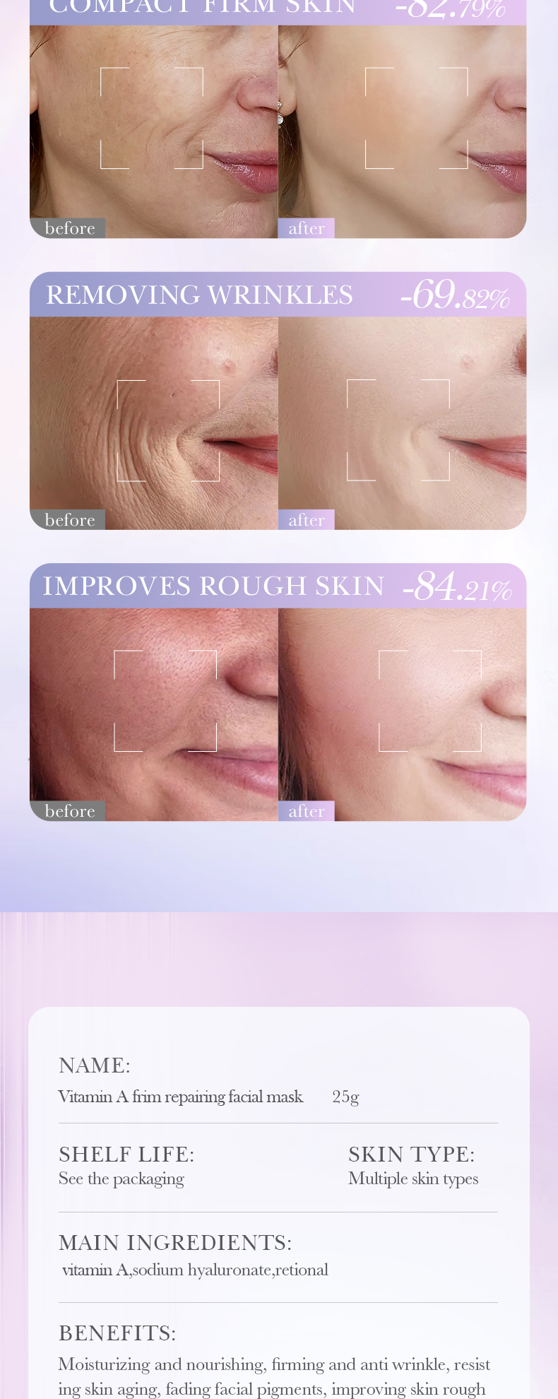 | Color | Vitamin A mask, Vitamin C Mask, Vitamin E Mask |
