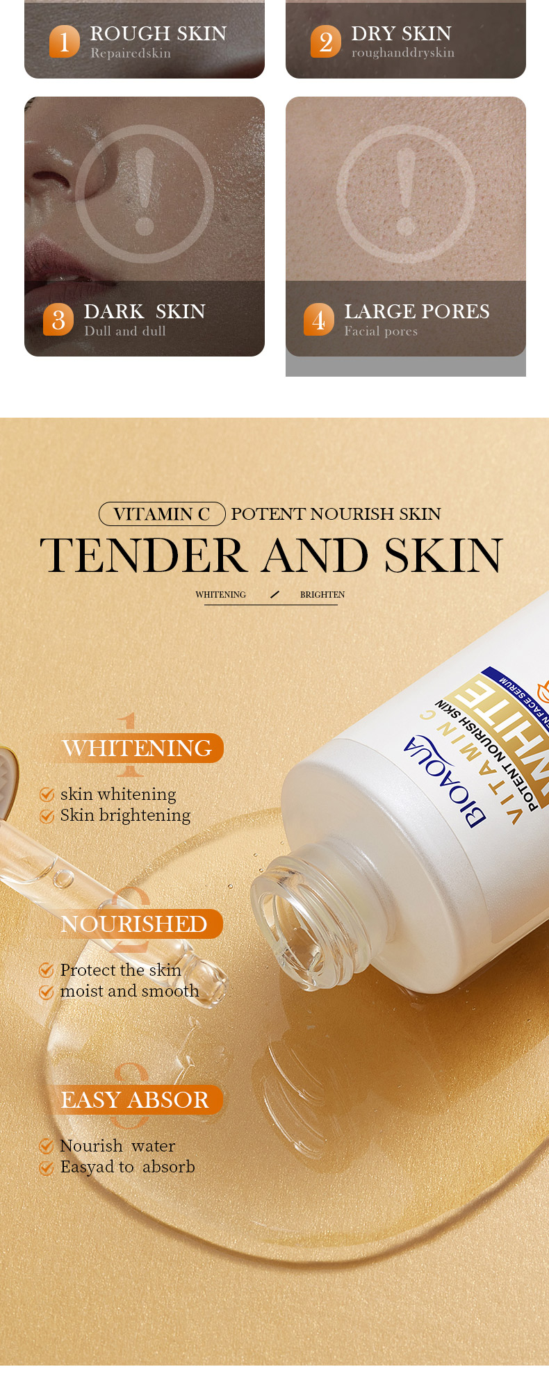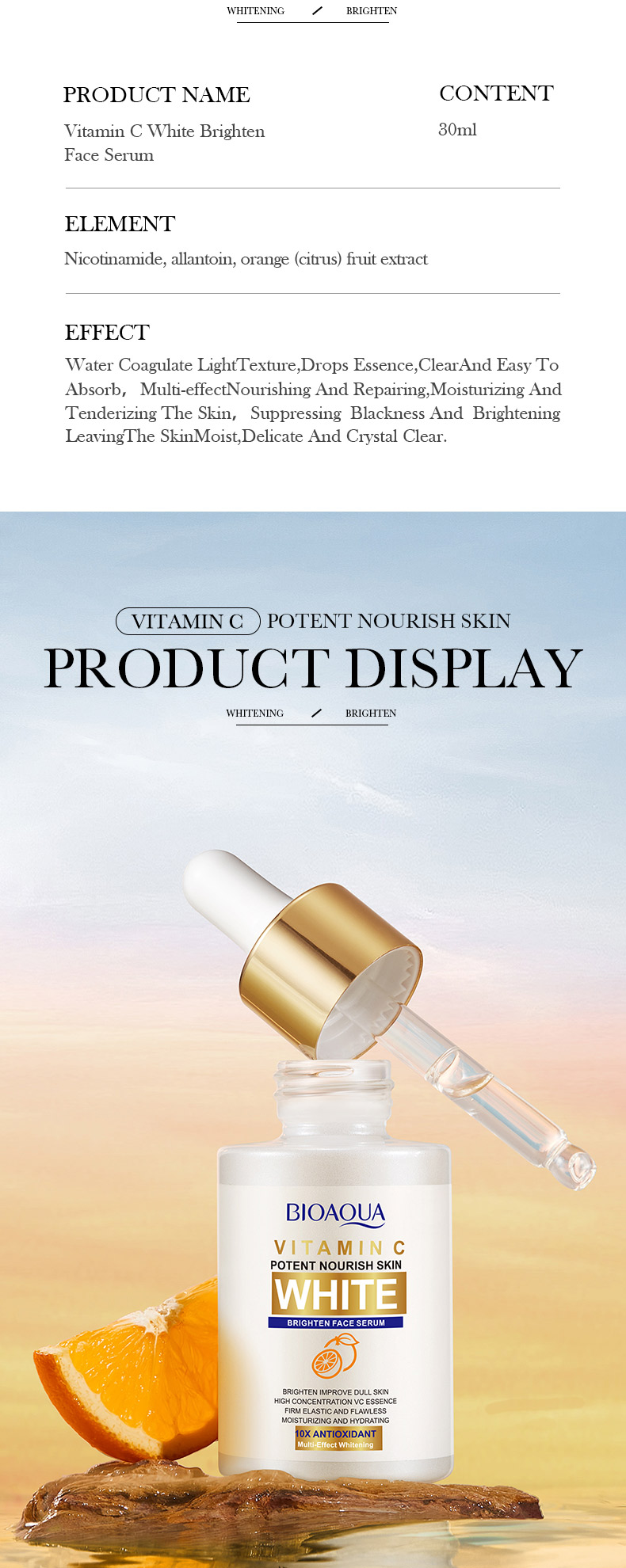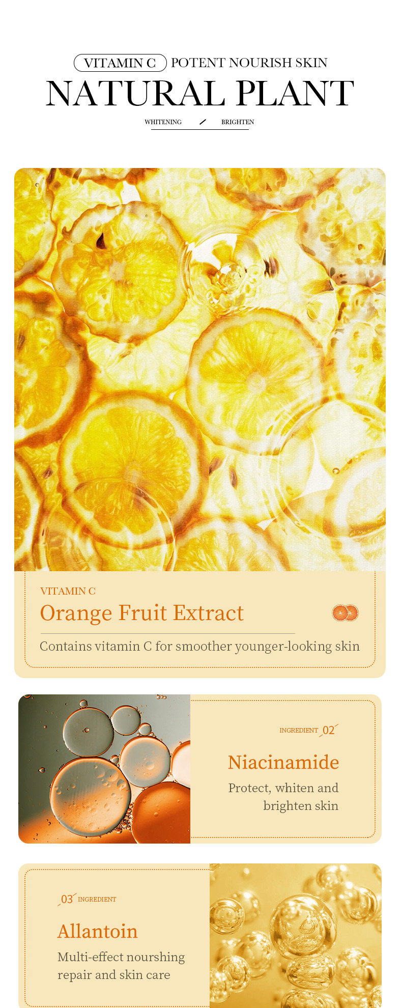 | Color | Serum, face cream, Body lotion, toner |