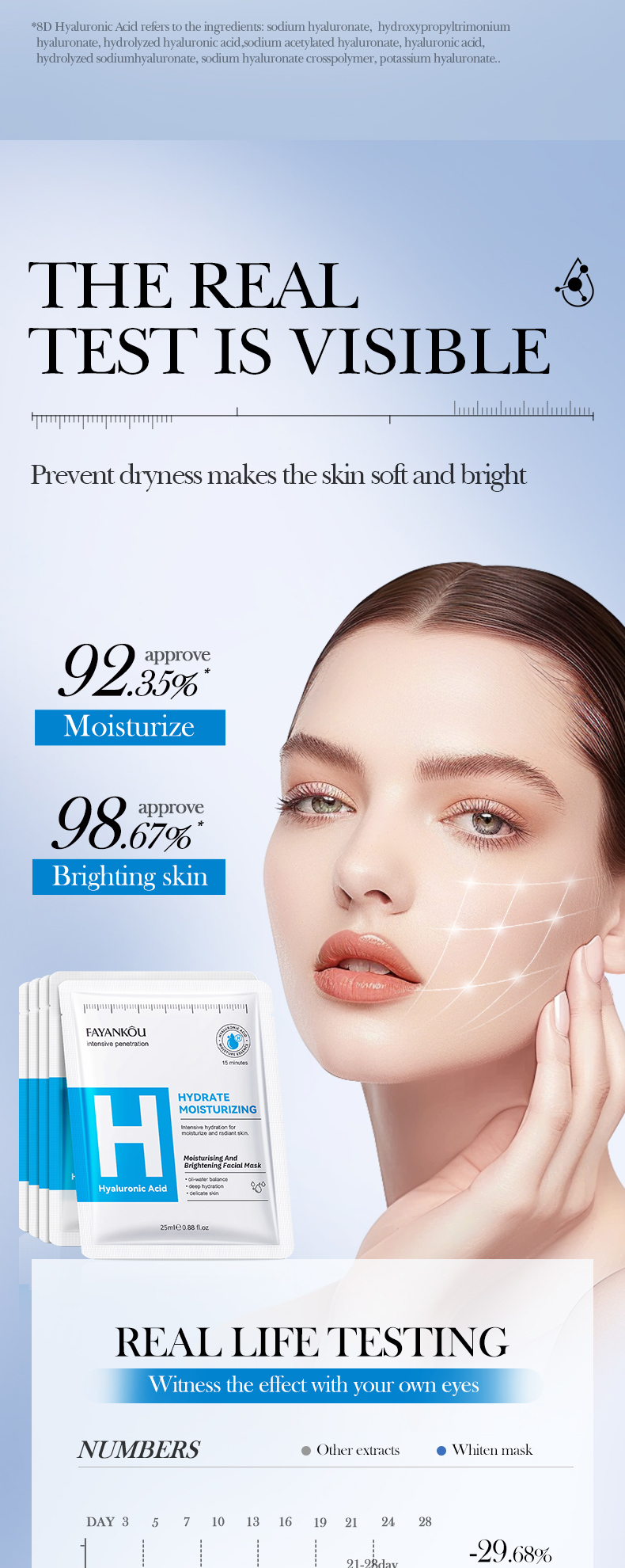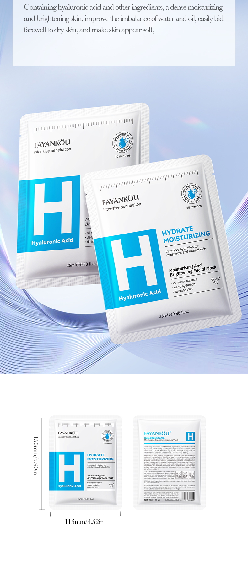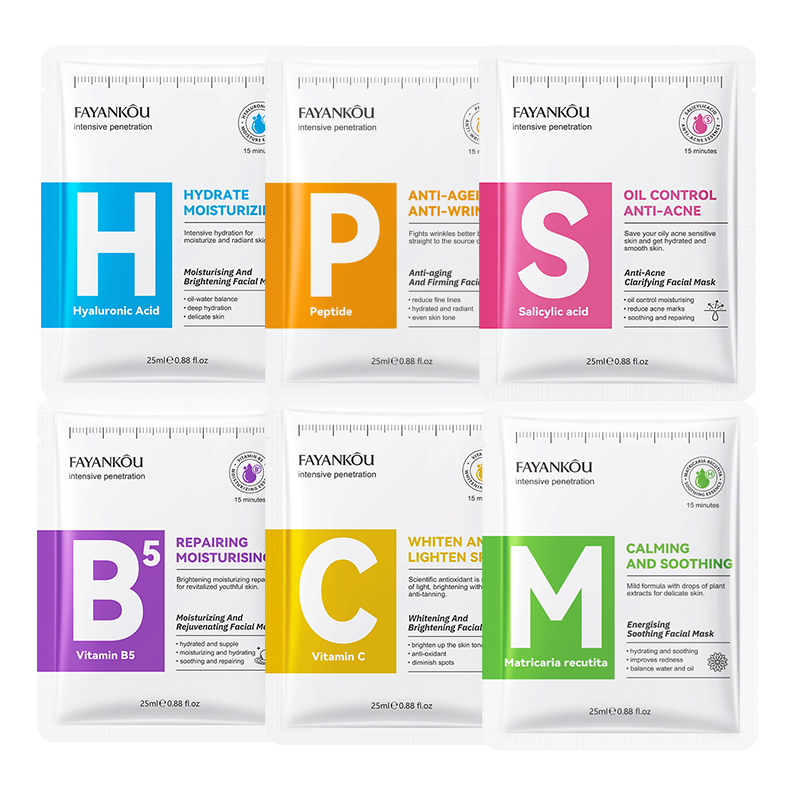 | Color | Hyaluronic acid mask, Peptide Anti-aging Mask, Salicylic acid mask, Vitamin B5 Mask, Vitamin C Mask, Chamomile Mask |