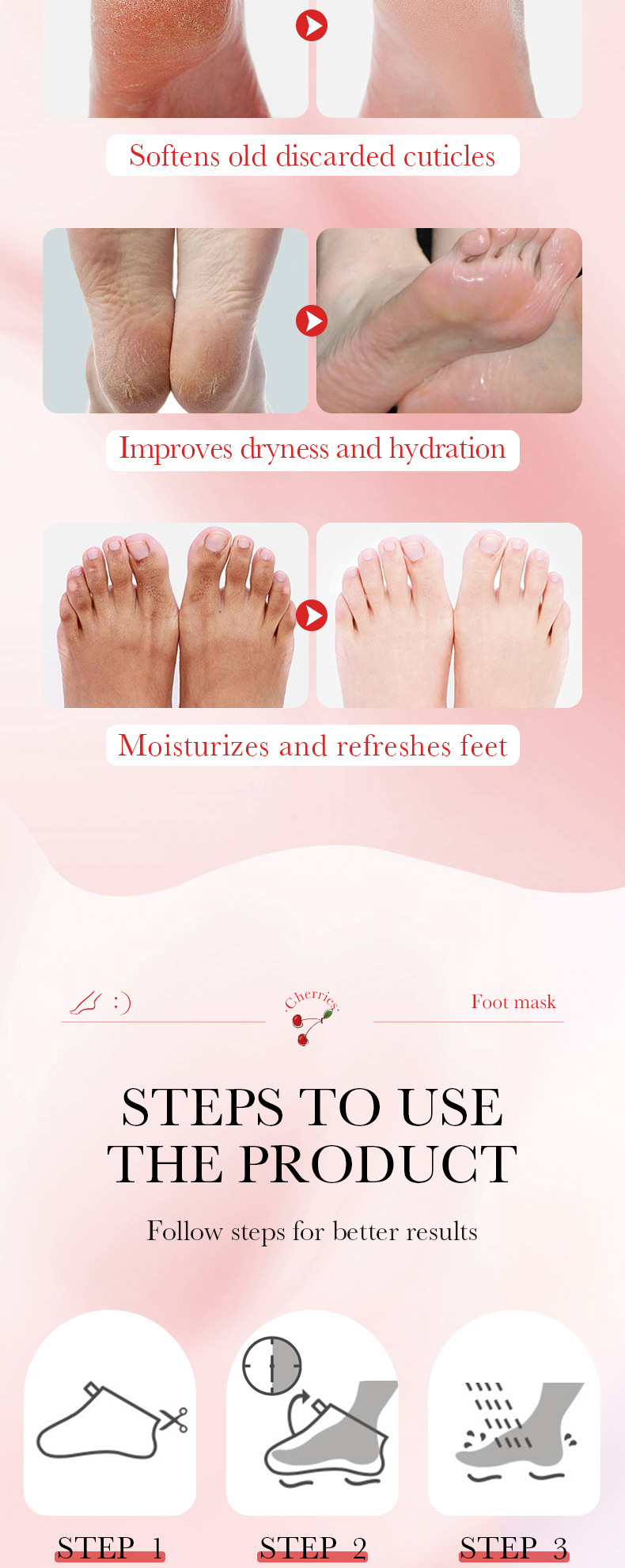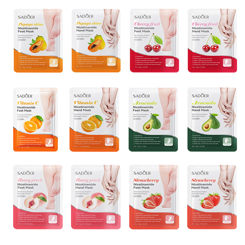 | Color | Avocado foot membrane, Avocado hand mask, Strawberry foot membrane, Strawberry hand mask, Peach foot mask, Peach hand mask, Vitamin C foot mask, Vitamin C hand mask, Cherry foot membrane, Cherry hand mask, Papaya foot mask, Papaya hand mask |